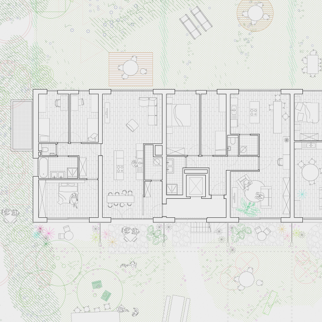 To allow urban densification, spaces need to incubate other functions through time. Today this room in the city connects a cluster composed of a garden, a vestibule towards the street, a family house, a garden house, and a student house next door. Defining the private and public city fabric as spatial atmospheres rather than with different function uses, accesses and passages are possible, providing opportunities for programming through time.