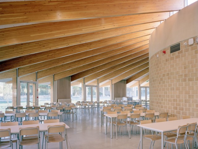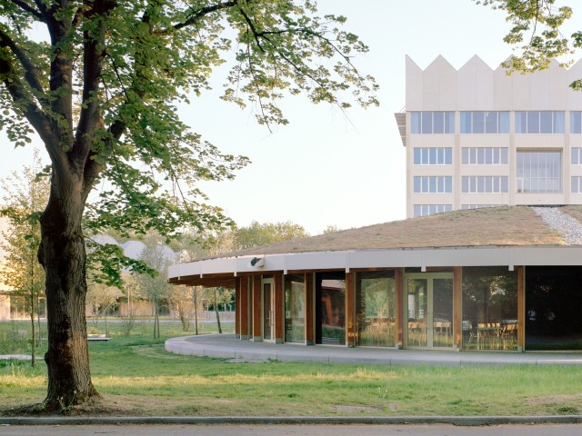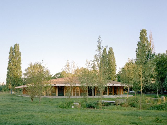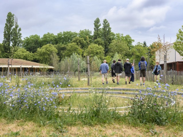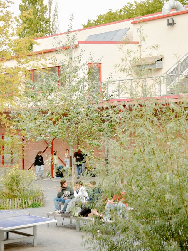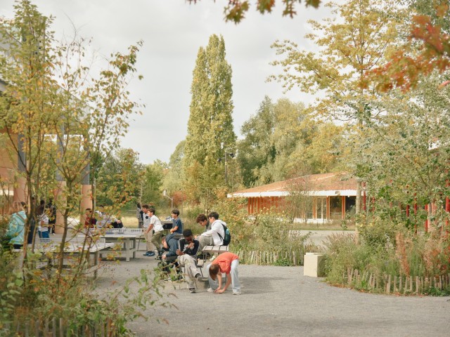 As such, the budgetary choice made it possible to accommodate a biodiverse landscape as the backbone of the project. The landscape acts as a prerequisite, forming the foundation that links all spaces together. There are no residual areas, all ground floors open widely onto the landscape, which actively contributes to the quality and everyday use of the park. Within this logic, the cafeteria pavilion was conceived as a pragmatic roof structure, a small artificial hill, organized around a central kitchen and open to the park.