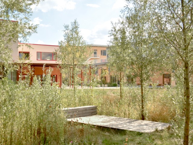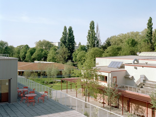 To perpetuate existing biodiversity, the landscape is structured around two intersecting biotopes crossing each other between and beneath the schools, a wetland system follows the inner path, while a wooded edge reinforces the embankment along the Ring. These two existing plant structures were preserved and strengthened, forming a rich, multilayered and perennial landscape, while ultimately reducing maintenance. The park also provides an ideal framework for the development of active, multifunctional spaces, capable of accommodating courtyards, cultural events, community gatherings and educational initiatives.