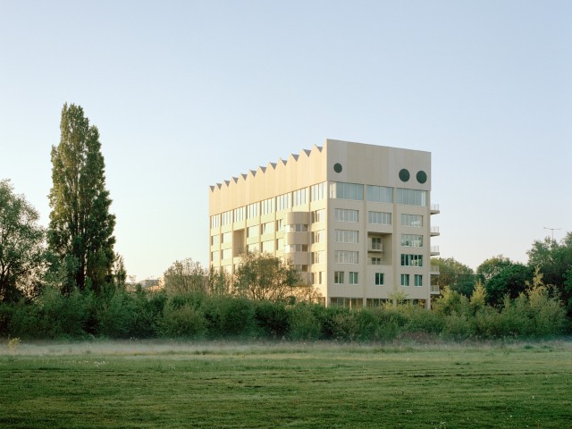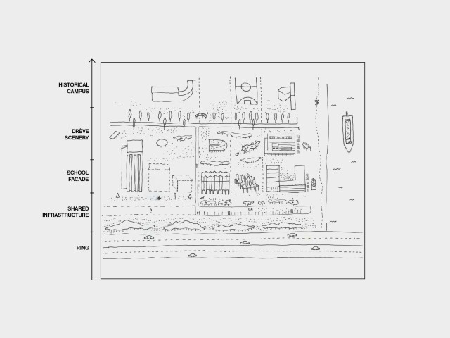 By reducing the footprint of the new buildings to a minimum, the project frees up space for the development of a park. The two new schools shape a built backdrop along the Ring and introduce a new façade for the campus towards the canal: a horizontal school close to the water and a vertical school facing the Ring. The rest of the site is conceived as a park, where a cafeteria and a sports hall stand as pavilions. Following the existing grid paths of the site and the logic of the existing façade, the project becomes an extension and an update of the original Ceria campus model.