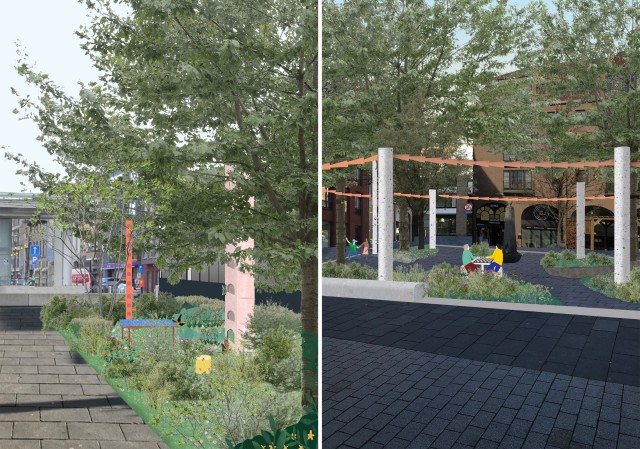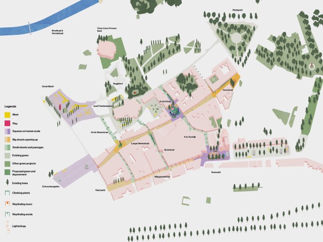 Additionally, iconic landmarks will punctuate the cityscape; several columns can be found standing at the Veemarkt as structuring elements, encircling the Grote Kring, and over the district accompanied by a table, a garland, or seating. From the luminous garland encircling Grote Kring’s central square to the colourful play elements and the relocation of the renowned fountain ‘De Dorstigen Laven’ in Veemarkt, these landmarks will intrigue and guide visitors through the district.