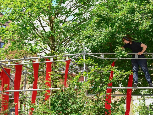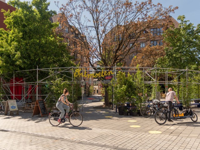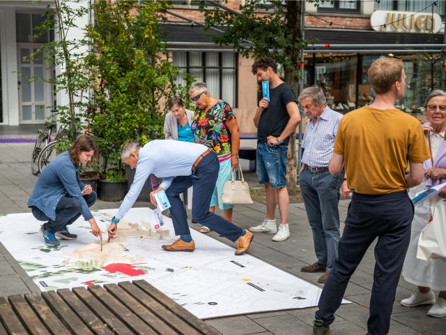 This project’s vision became clear through numerous meetings and workshops involving diverse stakeholders. Notably, two open-air temporary installations provided platforms for experimentation and engagement. On Grote Kring, a half-circular temporary structure included a 12m long table and benches, red fabric swings, and evening lights, and the irrigation system for a mobile forest, creating shade and coolness. A play box accompanied the existing terraces on the square. And on the Veemarkt, a linear structure with a slide and multiple strips done by Sew4Life in addition to a mobile forest. These participatory endeavours enabled us to refine our approach and gather valuable feedback from the shopkeepers and local community.