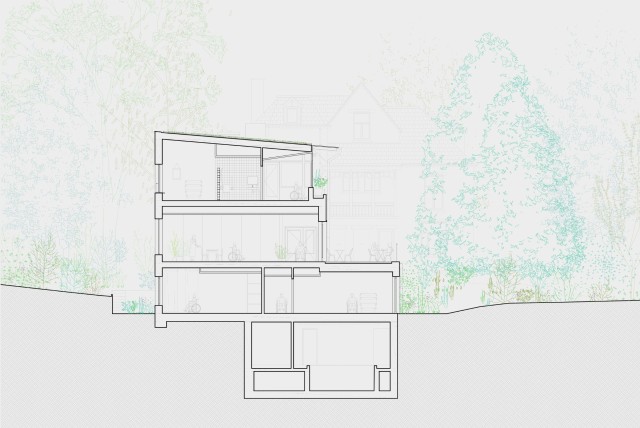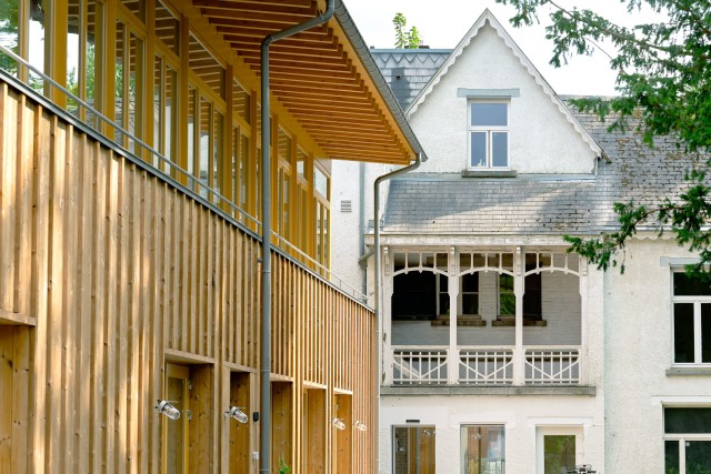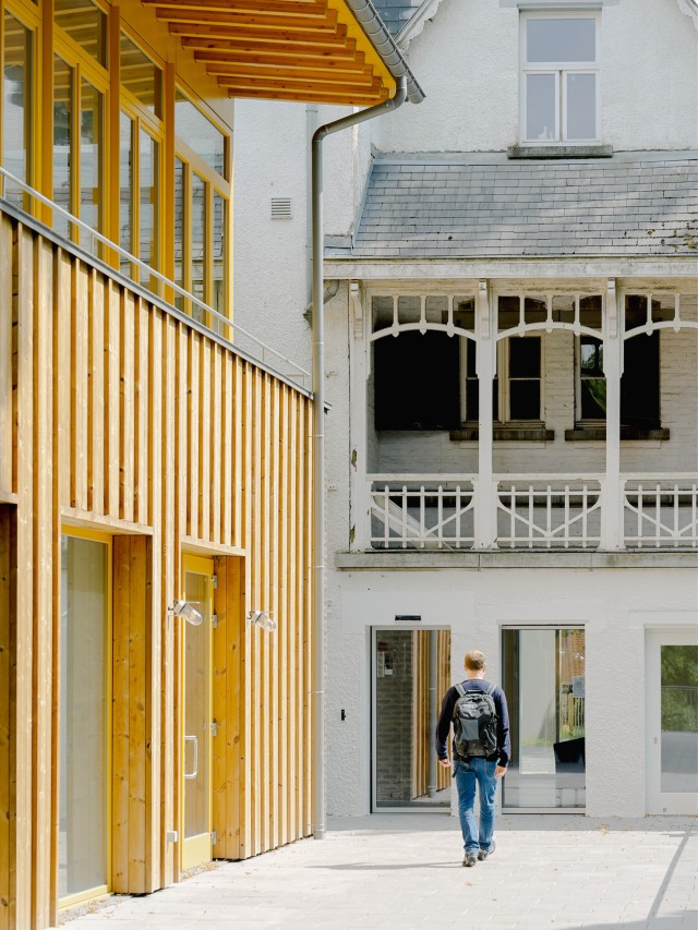 The project combines the renovation of an existing villa with the construction of a residence and day center for people with multiple disabilities. In a context marked by a shortage of dedicated housing in Brussels and Belgium, it rethinks care spaces as inclusive environments, fully embedded in everyday life.The design aims for a house for all: accessible, inclusive, and offering privacy when needed. The site is conceived as a small habitat with varied ways of nesting, moving from garden to wooded area to create graduated forms of shelter. A sequence of spaces sets different degrees of intimacy and together shapes a collection of living environments where openness is defined by the quiet sense of refuge and benevolence it supports.Located in Uccle, 7 km from the city center, the site slopes from south to north and is characterised by a dense and varied vegetation. Positioned at the centre of a 600-metre-long block, the project introduces a discreet pedestrian path that initiates a transversal crossing through the block. This passage both shortens routes at the neighbourhood scale and creates a condition where encounters can occur naturally between the inhabitants of Tous Ensemble and the neighborhood. The project’s first phase: the Residence and the passage through the Villas, sets the foundations of a larger masterplan still unfolding: the renovation of the existing Villa, the entrance Pavilion, and the greenhouse on Av. des Chalets. Each of these future steps will extend the system already in place, allowing the site to mature as a set of interconnected environments.