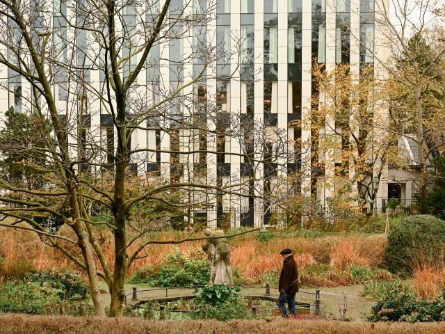 The building embeds itself in the adjacent residential area by offering specific spatial amenities like a piano nobile, a canopy and outdoor terraces. The interaction with the public space is enhanced by opening up the ground floor towards the square, accessing three entrance lobbies, a bar and the co-working spaces. Embracing visitors, office workers, hotel guests underneath the canopy, the square acts as the ground-floor lobby. The interior fitting of the entrance floor is open to enhance relations and interaction between different users with different purposes. Although privately managed, this intersection of users contributes to the shared public value of the ground-floor space.